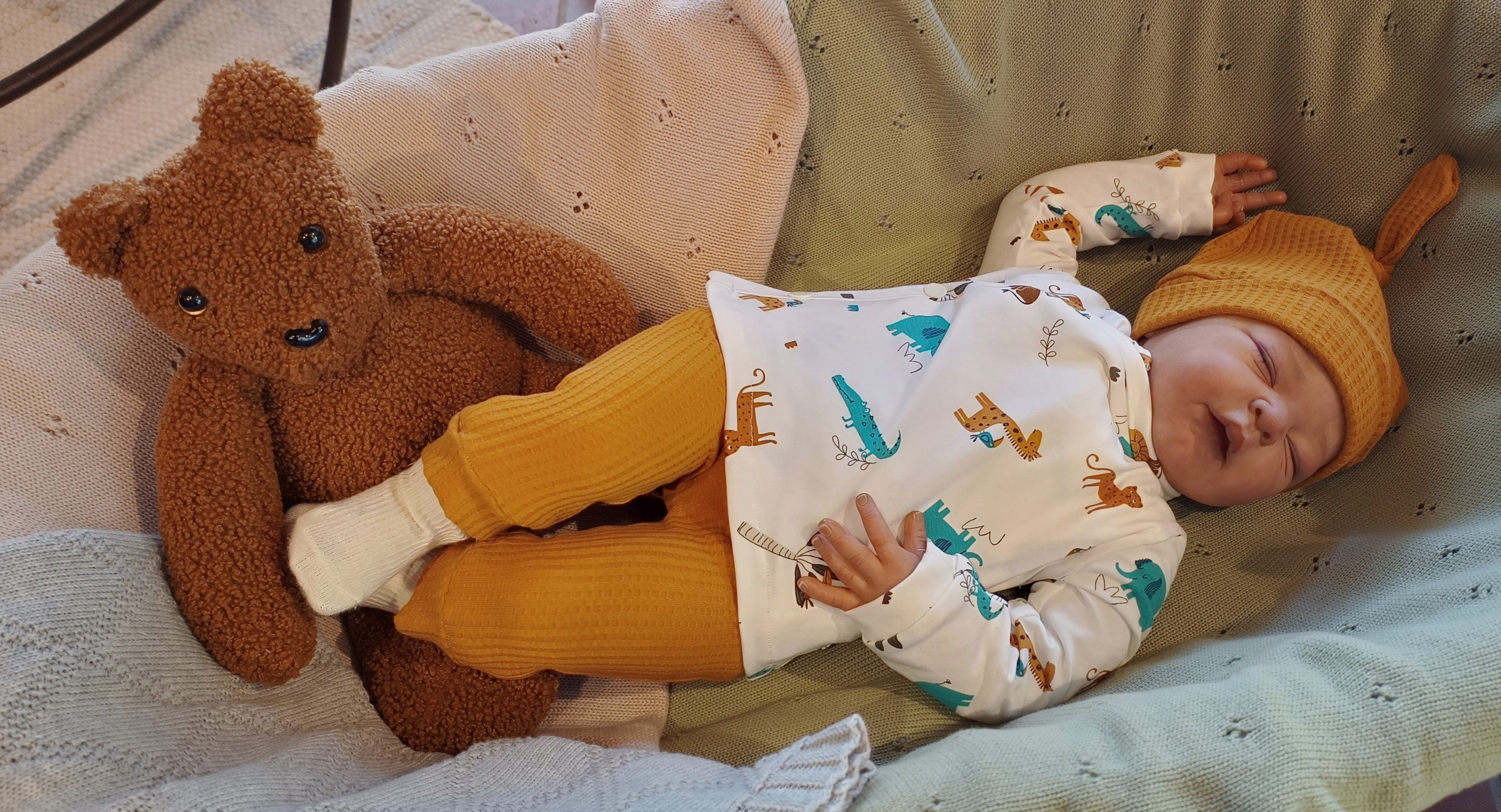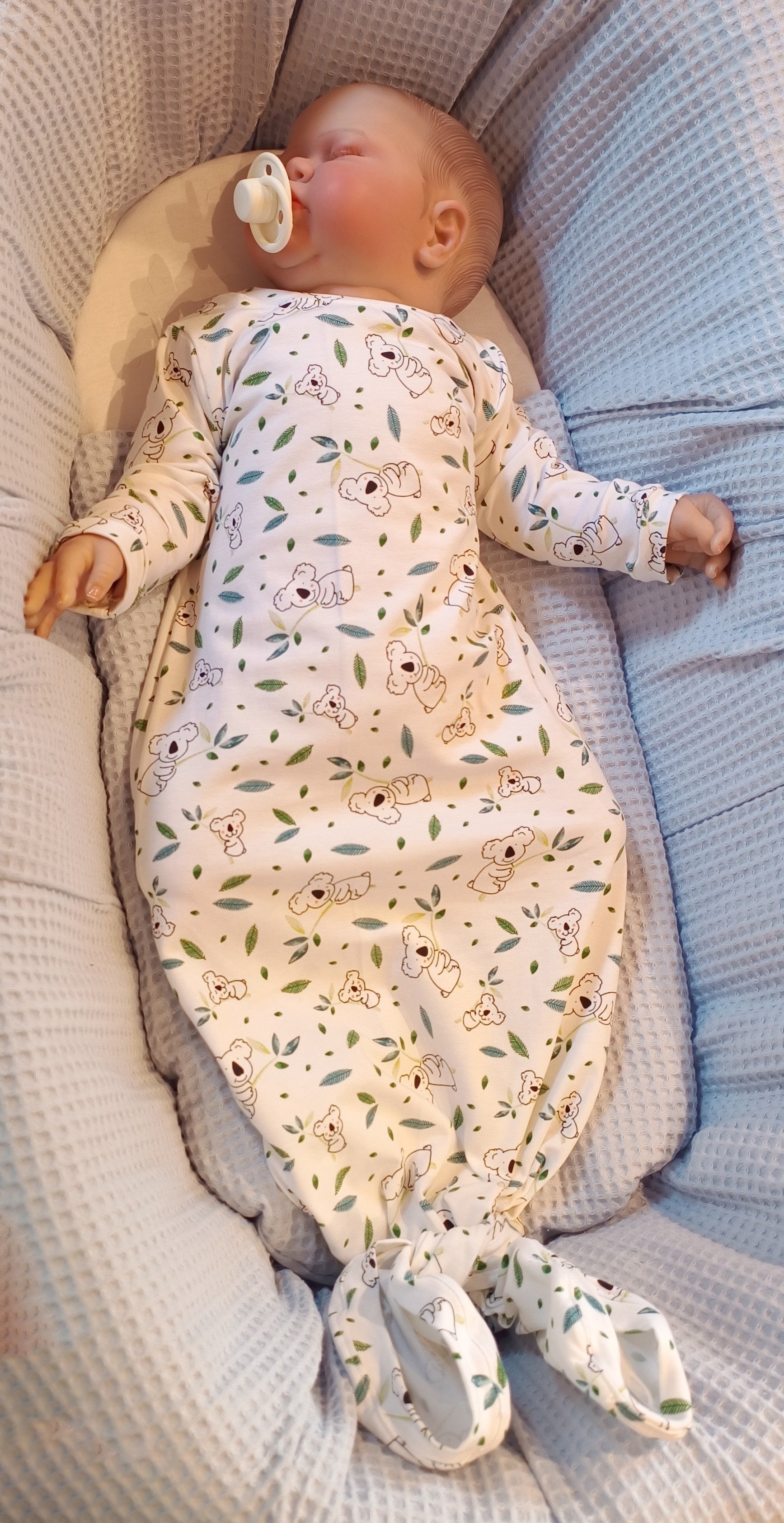 In de knoop slaapzak van By MamaLien zal je kleintje heerlijk kunnen slapen. En heeft het voldoende bewegingsruimte met de beentjes maar komt het nooit bloot te liggen.